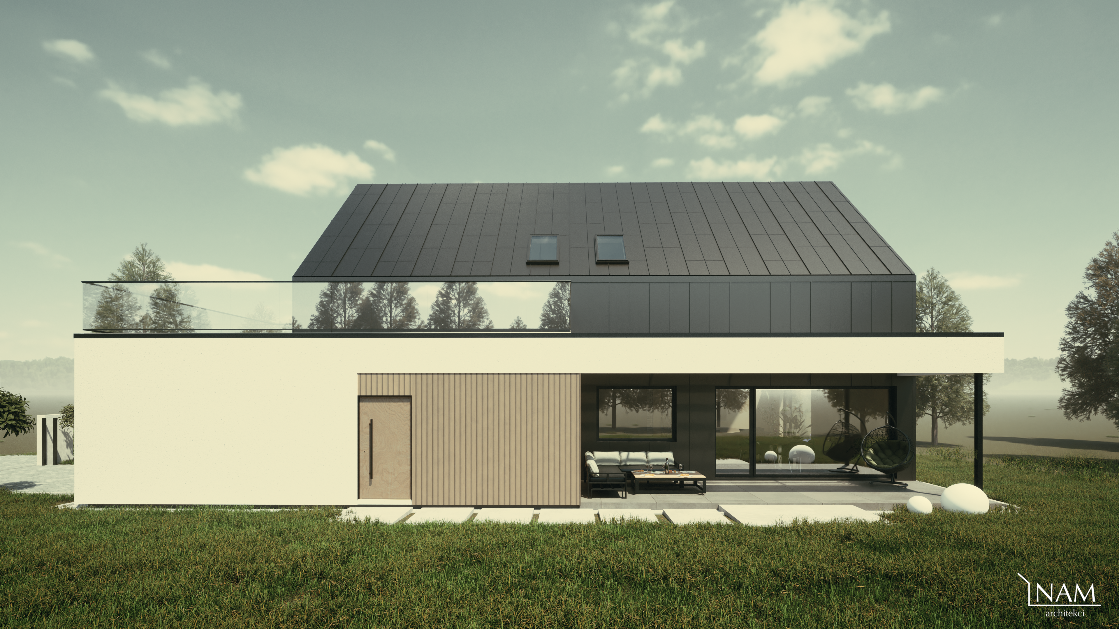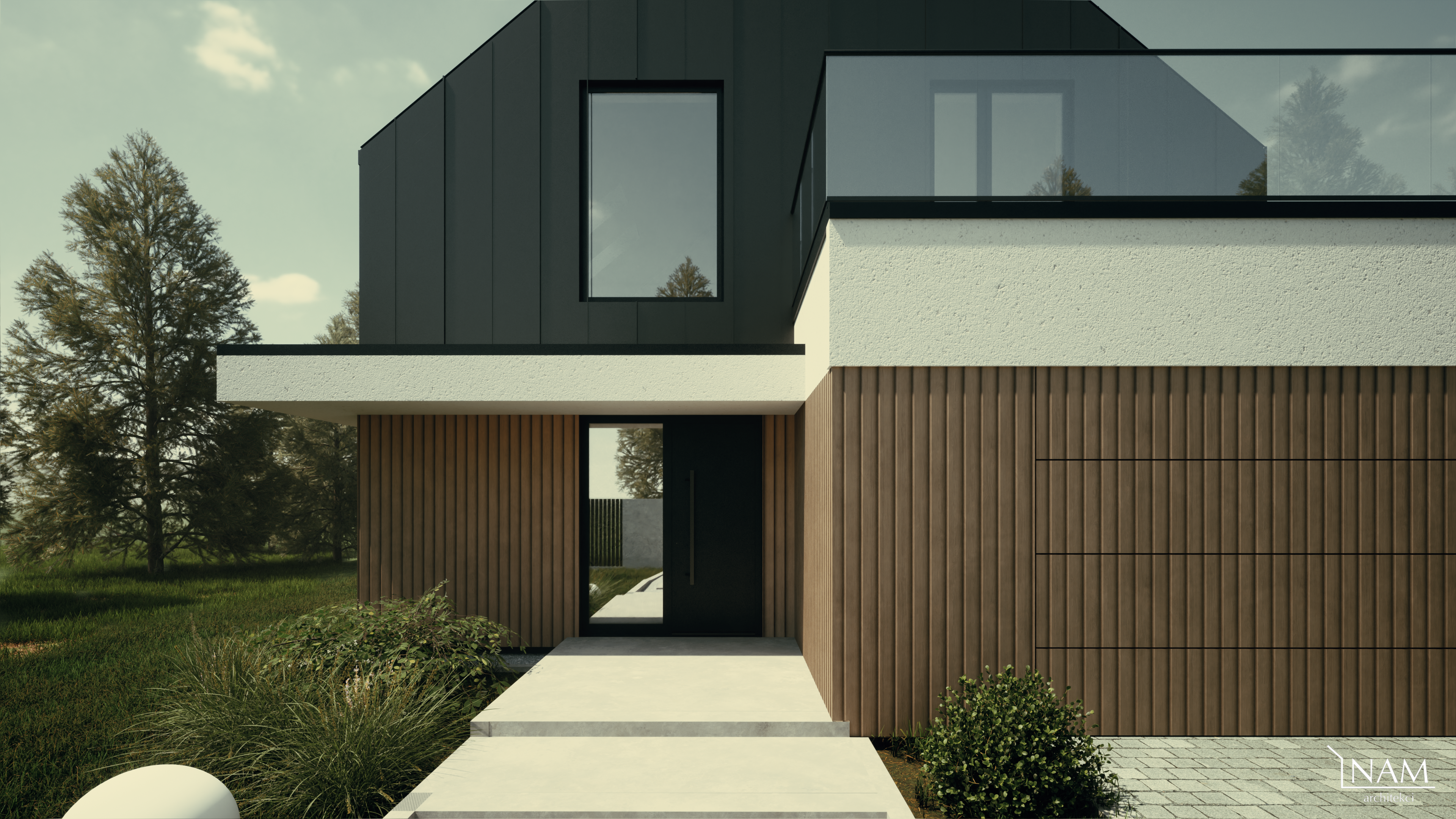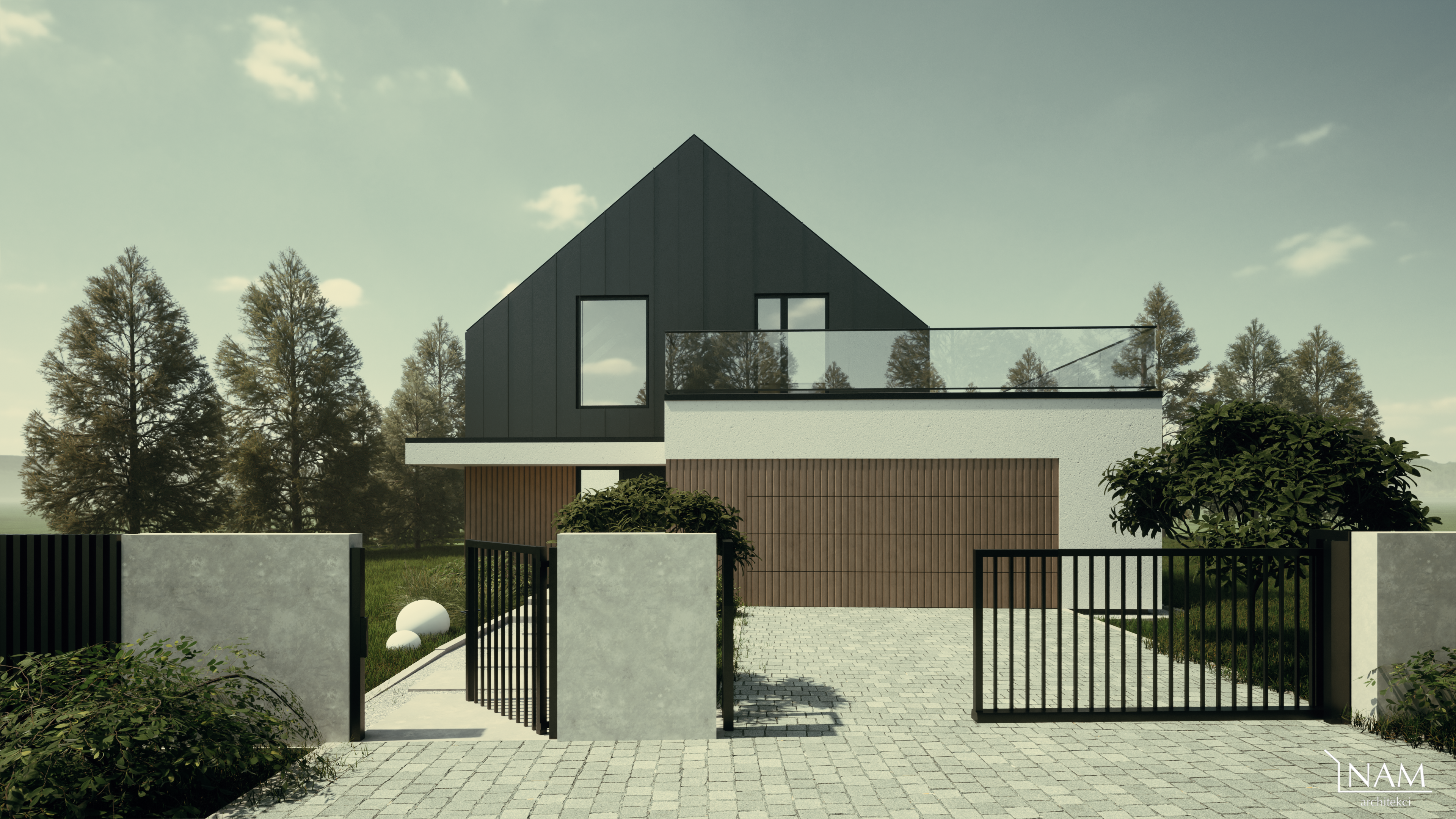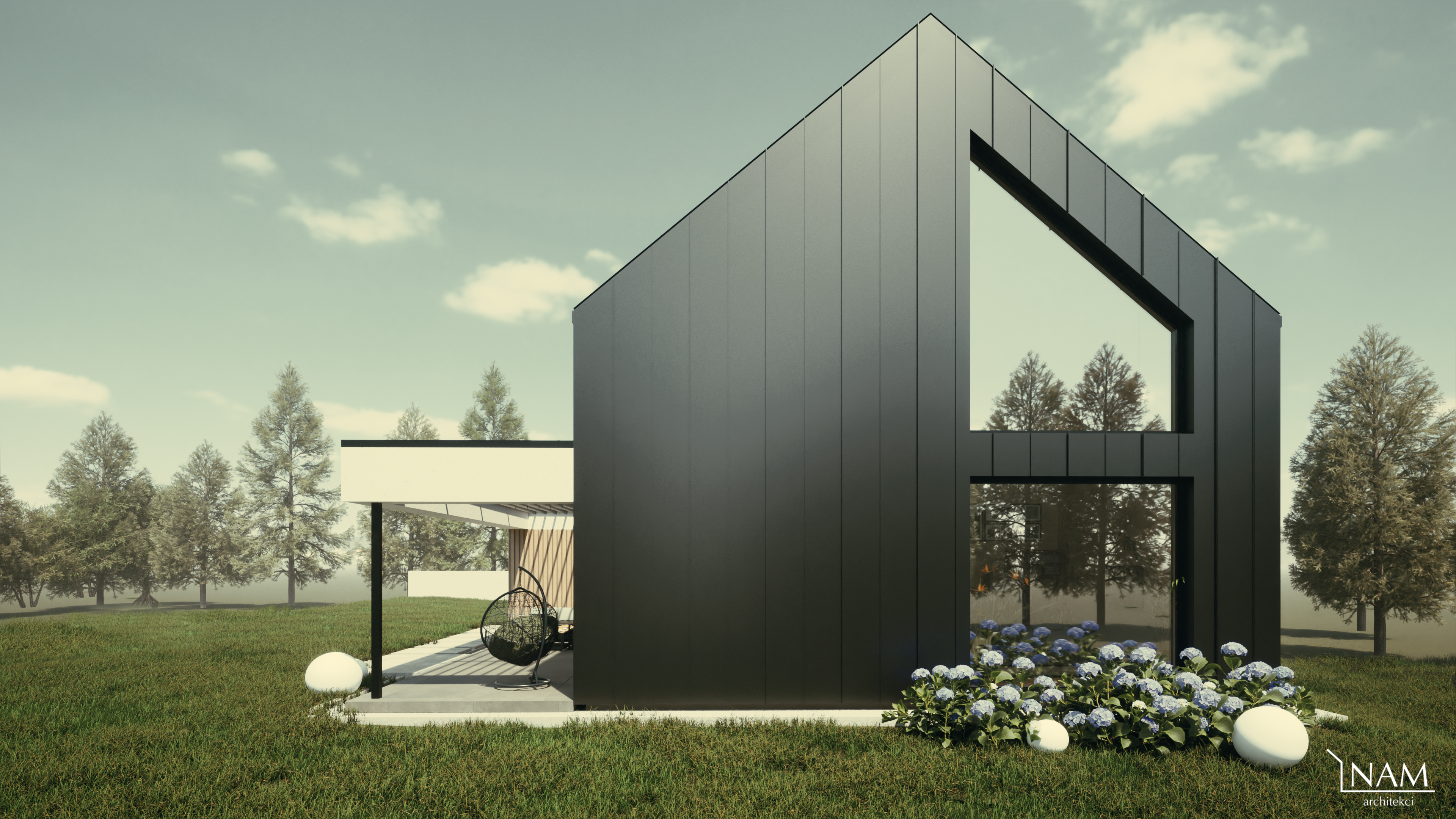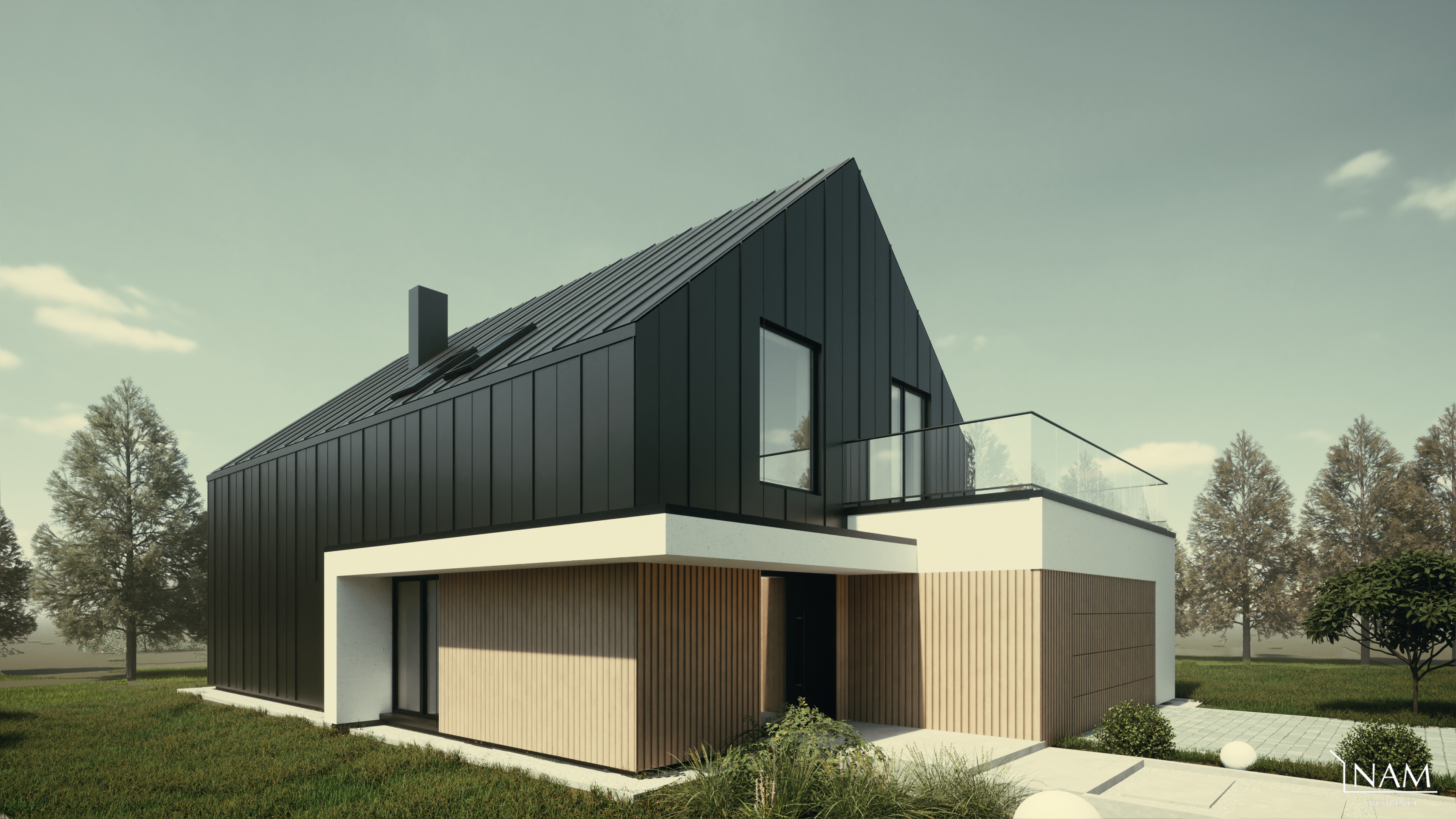Projekt nowoczesnego domu KR_5 wyróżnia się minimalistyczną, elegancką formą z bezokapowym dachem dwuspadowym, który podkreśla współczesny charakter budynku. Elewacja została wykończona blachą na rąbek stojący, zestawioną z naturalnymi elementami drewnianymi, co tworzy spójną i wyważoną kompozycję materiałową.