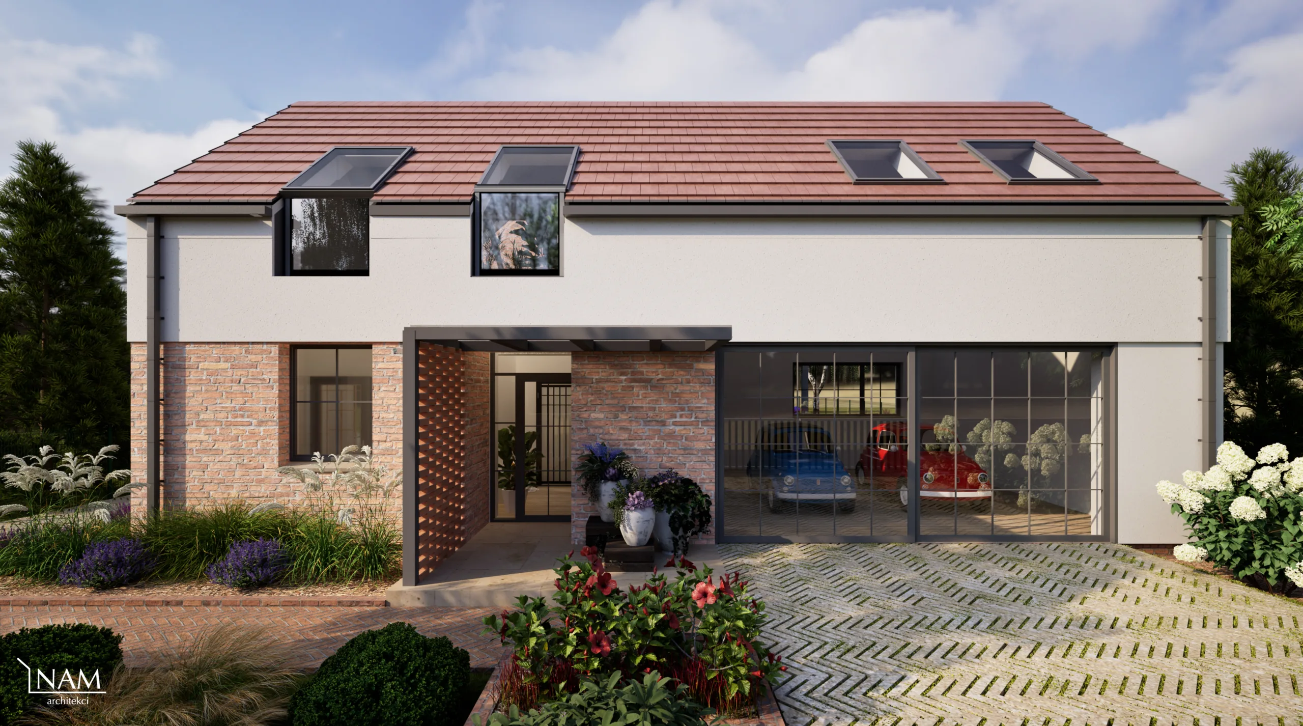 Projekt, który łączy funkcję mieszkalną z przestrzenią pasji – kameralnym salonem ekspozycyjnym dla aut zabytkowych. To nowoczesna interpretacja tradycyjnej formy domu z dwuspadowym dachem, w której prostota i elegancja idą w parze z funkcjonalnością.