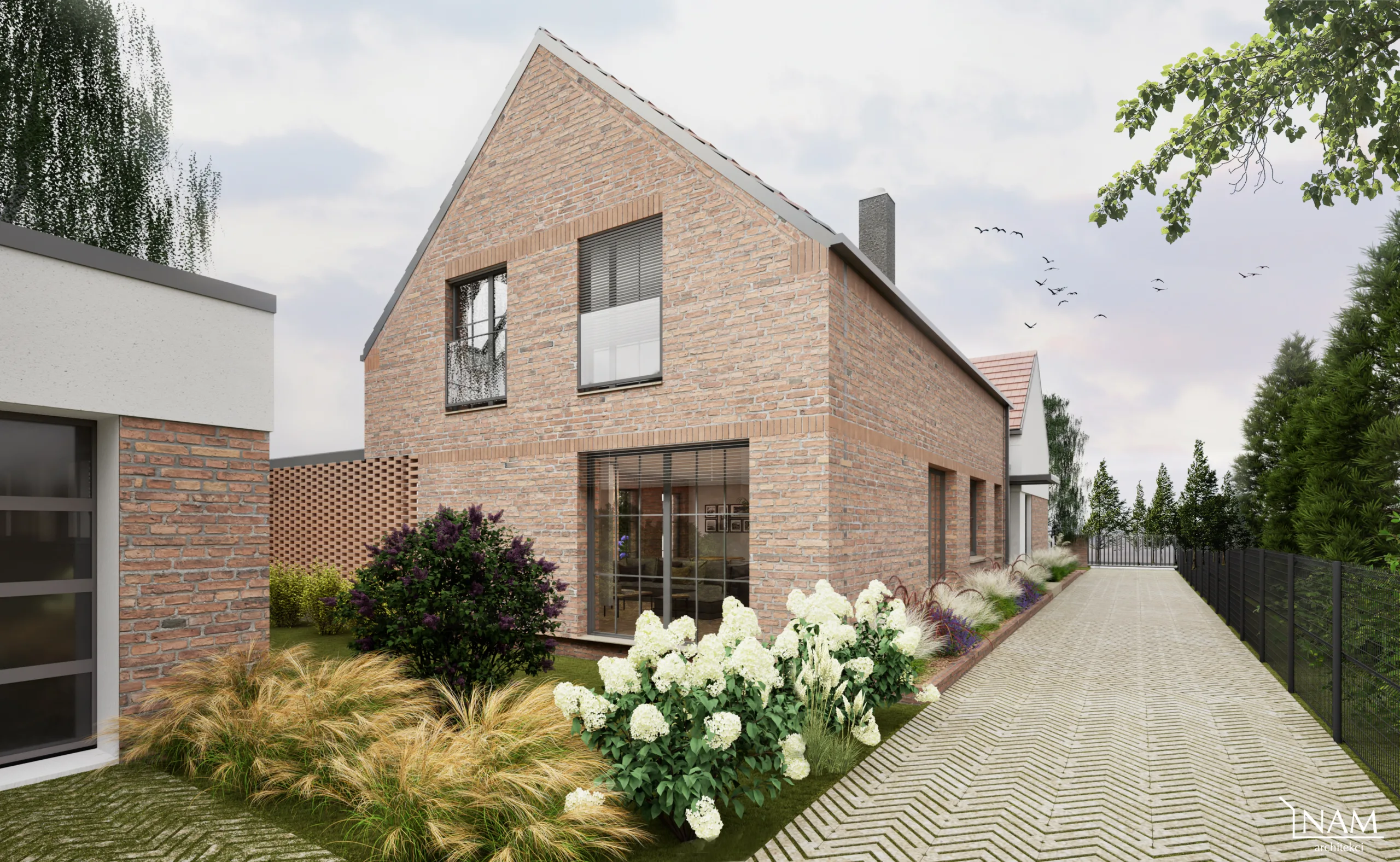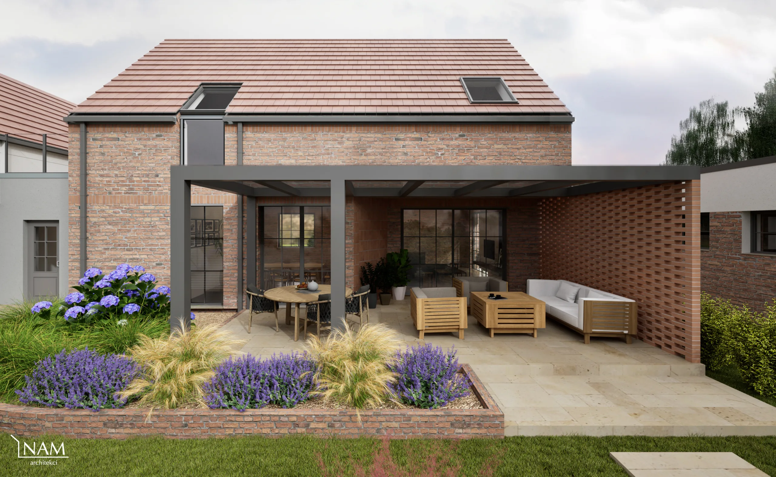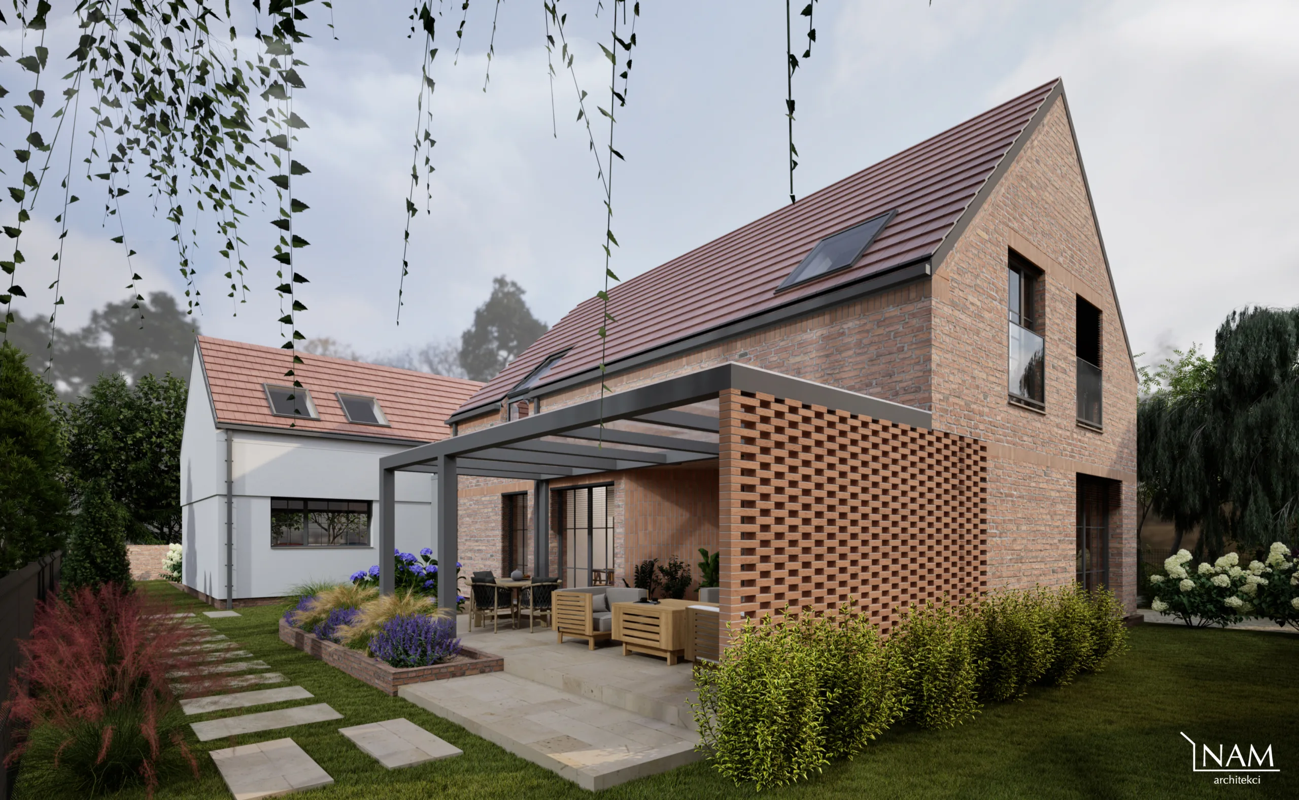 Bryłę budynku kształtują naturalne materiały: cegła klinkierowa, jasny tynk i stal, tworząc harmonijną kompozycję o ponadczasowym charakterze. Duże przeszklenia otwierają wnętrza na ogród i światło, a lekka stalowa pergola z ażurową ceglaną ścianą definiuje przytulny taras wypoczynkowy.
