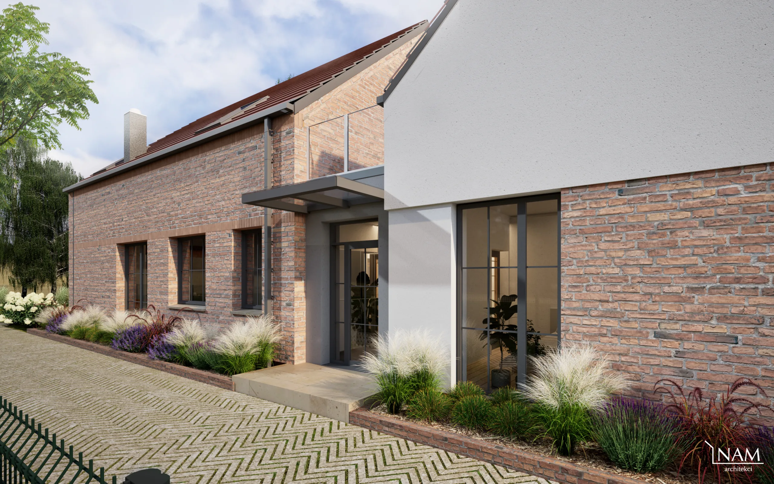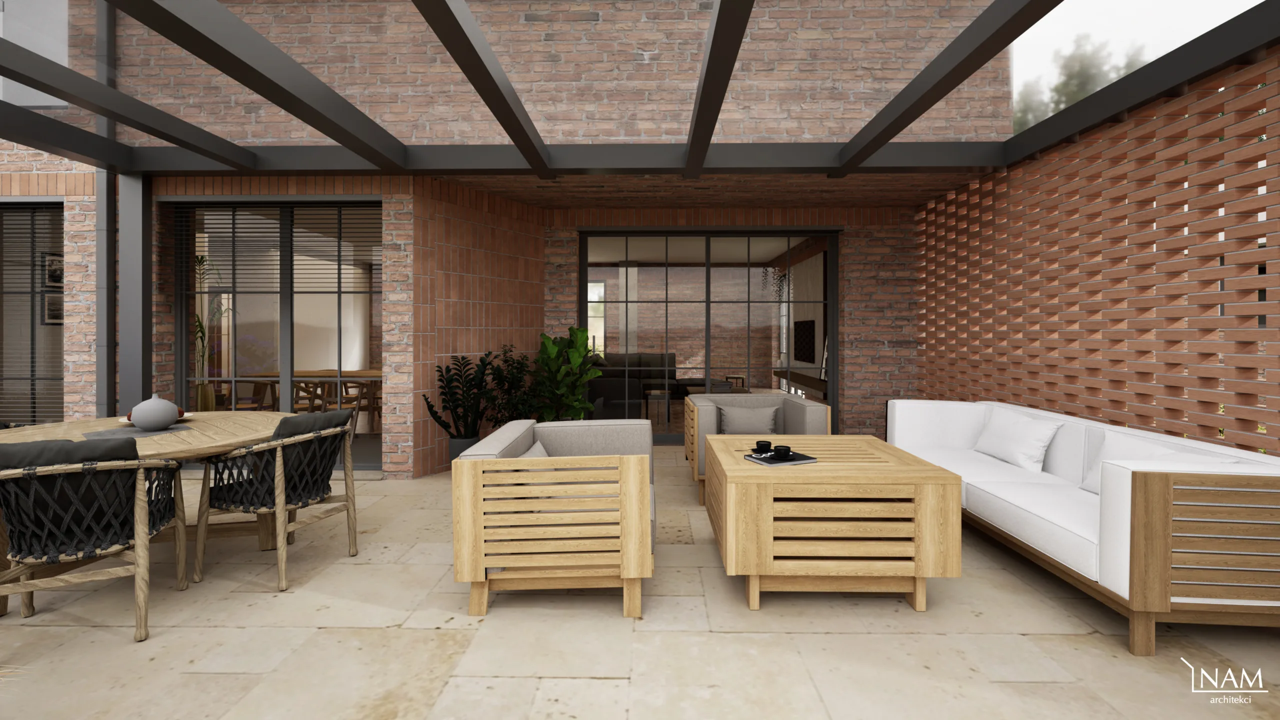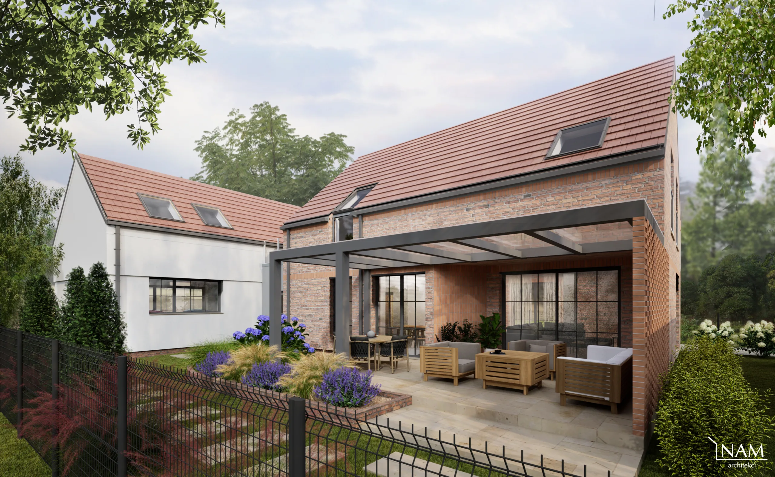 Bryłę budynku kształtują naturalne materiały: cegła klinkierowa, jasny tynk i stal, tworząc harmonijną kompozycję o ponadczasowym charakterze. Duże przeszklenia otwierają wnętrza na ogród i światło, a lekka stalowa pergola z ażurową ceglaną ścianą definiuje przytulny taras wypoczynkowy.